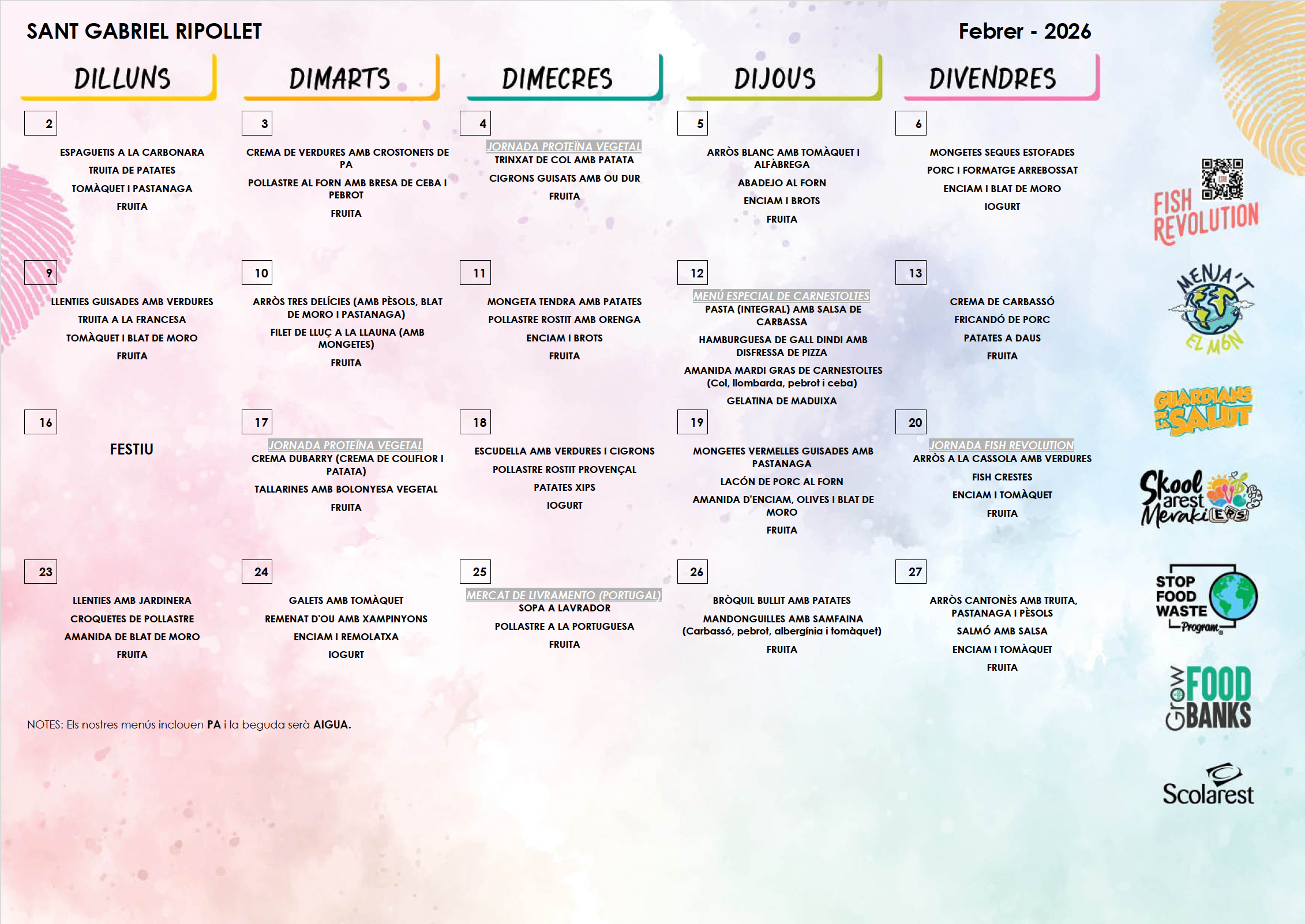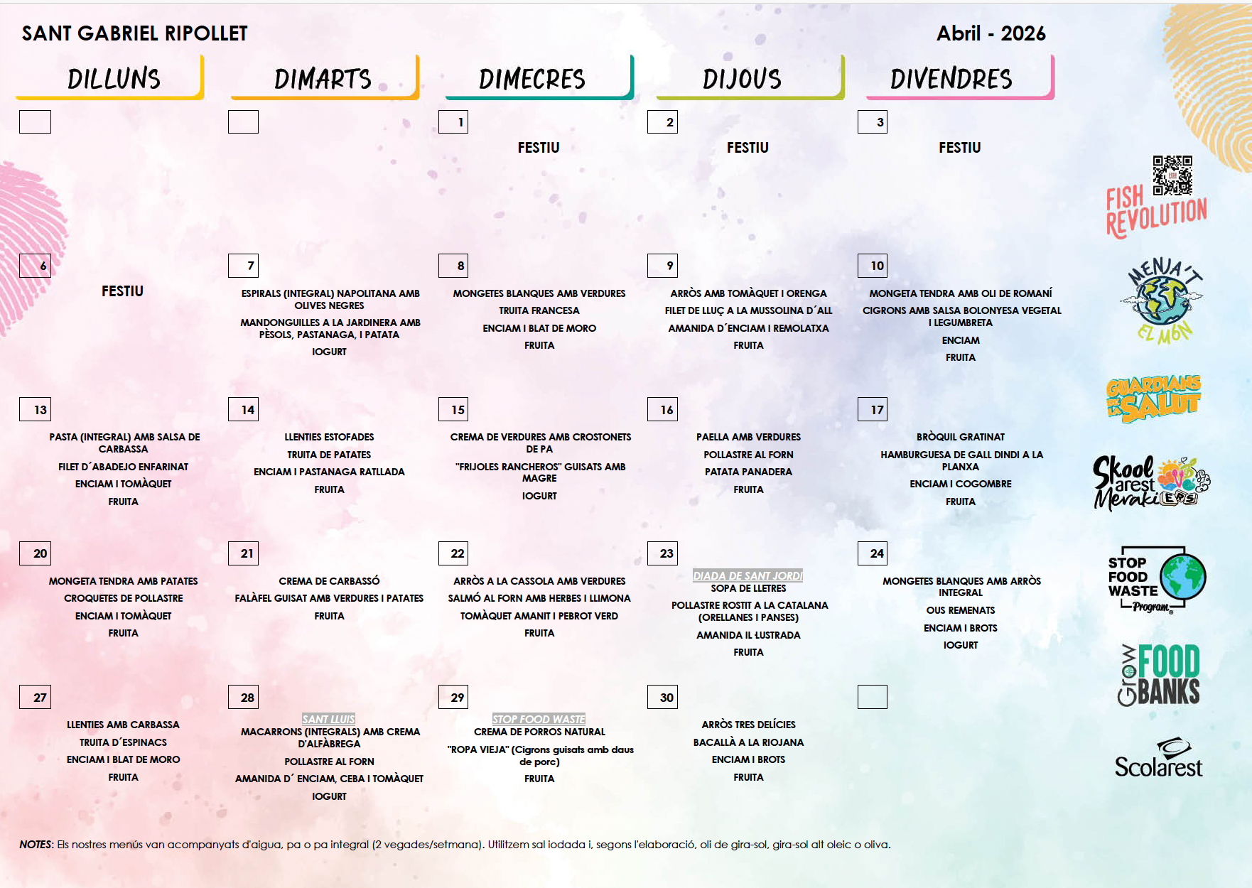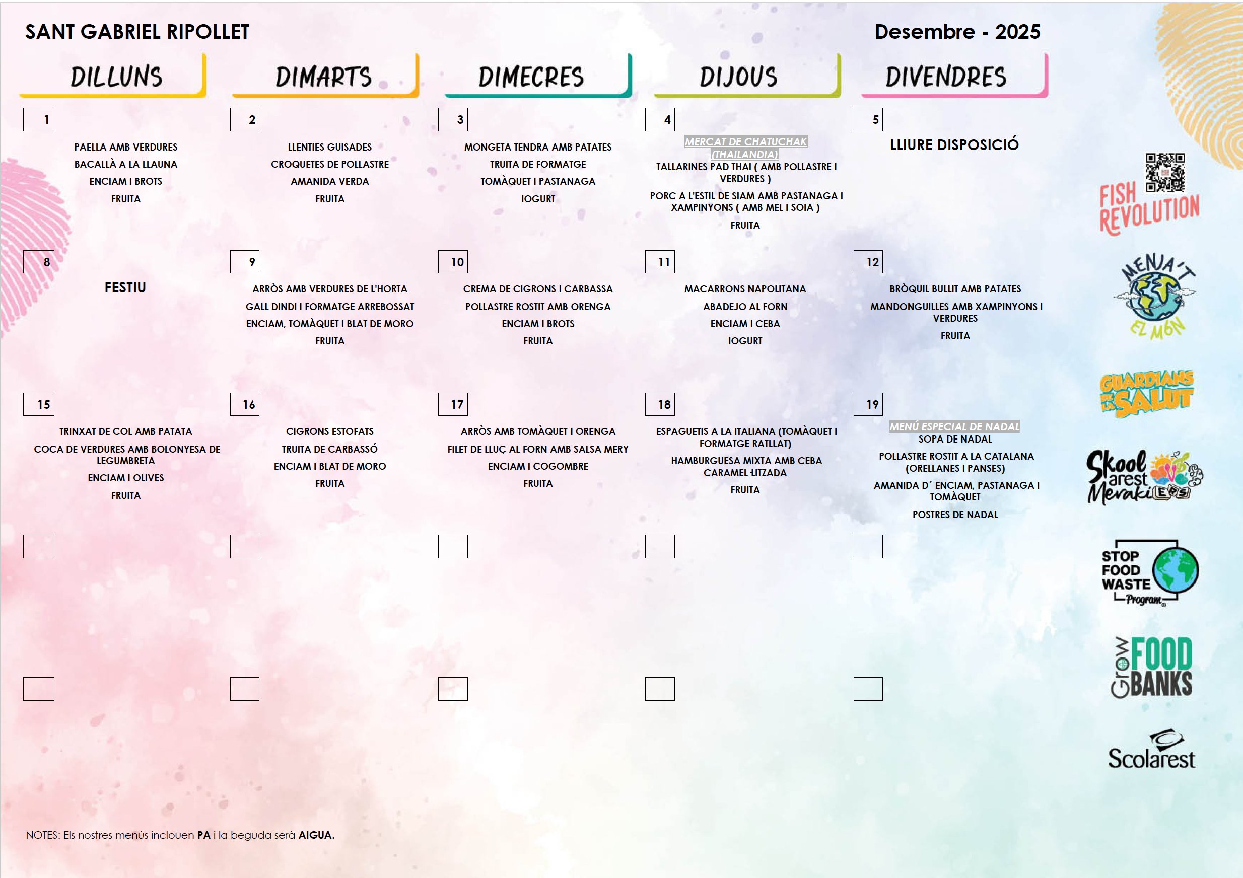 El menú canvia de forma mensual; es pot consultar a continuació: si hi cliqueu s’obriran les opcions d’al·lèrgens.